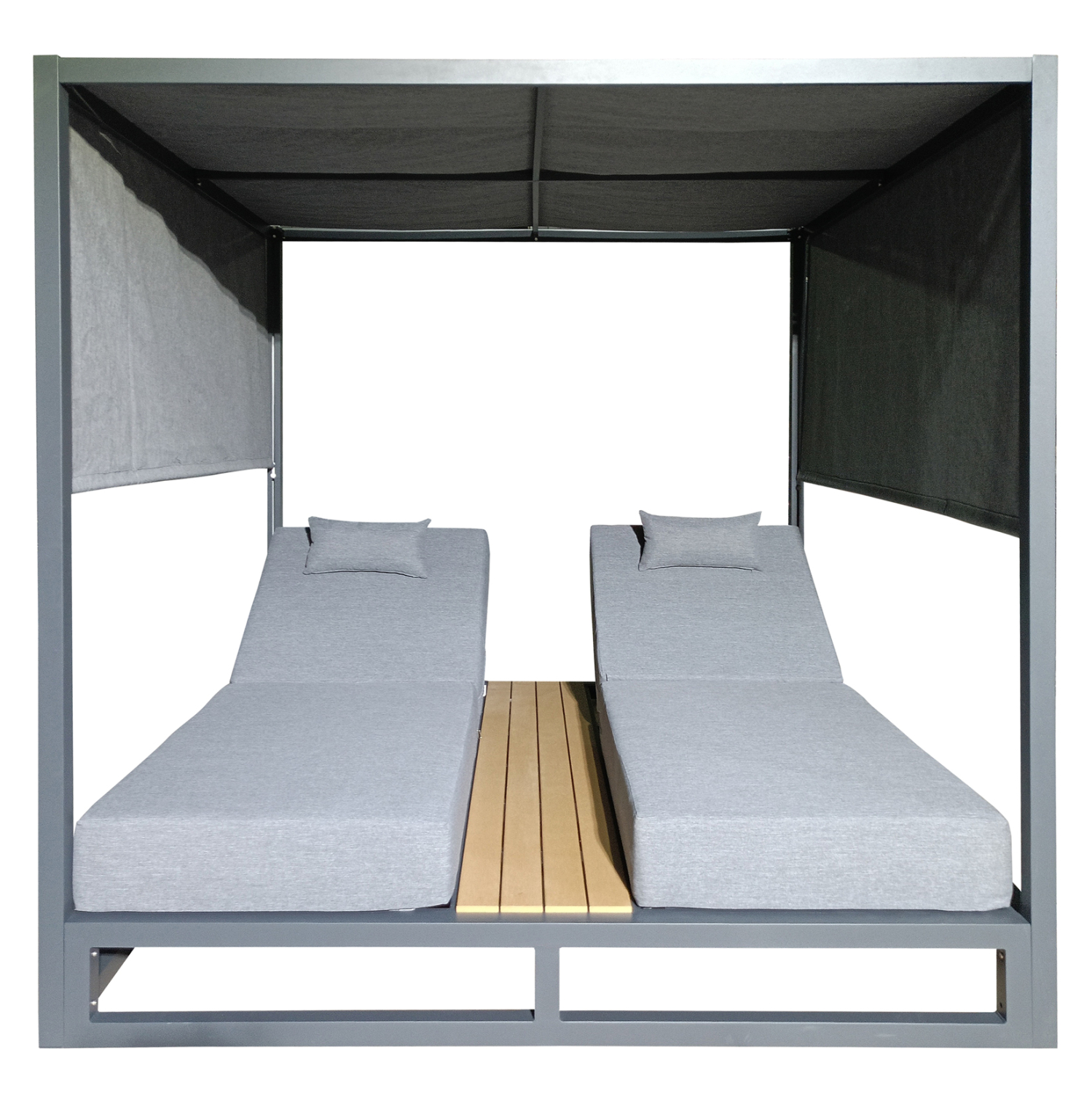 Η επαγγελματική διπλή ξαπλώστρα παραλίας GALLANT σε ΓΚΡΙ χρώμα, είναι μια πολυτελής πρόταση για την επιχείρησή σας. Η στιβαρή και εντυπωσιακή παρουσία της που οφείλεται στο design κύβος αλλά και στα υλικά κατασκευής της, κυριολεκτικά κλέβουν την παράσταση. Το παχύ στρώμα με τα μαξιλαράκια κεφαλής και η επιφάνεια από polywood στην μέση υπόσχονται στιγμές ξενοιασιάς και χαλάρωσης, όπως και το σκίαστρο που προστατεύει από τον ήλιο. TIP: Το σκίαστρο ανεβοκατεβαίνει στις δύο πλευρές ταυτόχρονα με απλό τράβηγμα, μιας και αποτελείται από ένα συνεχόμενο ύφασμα.