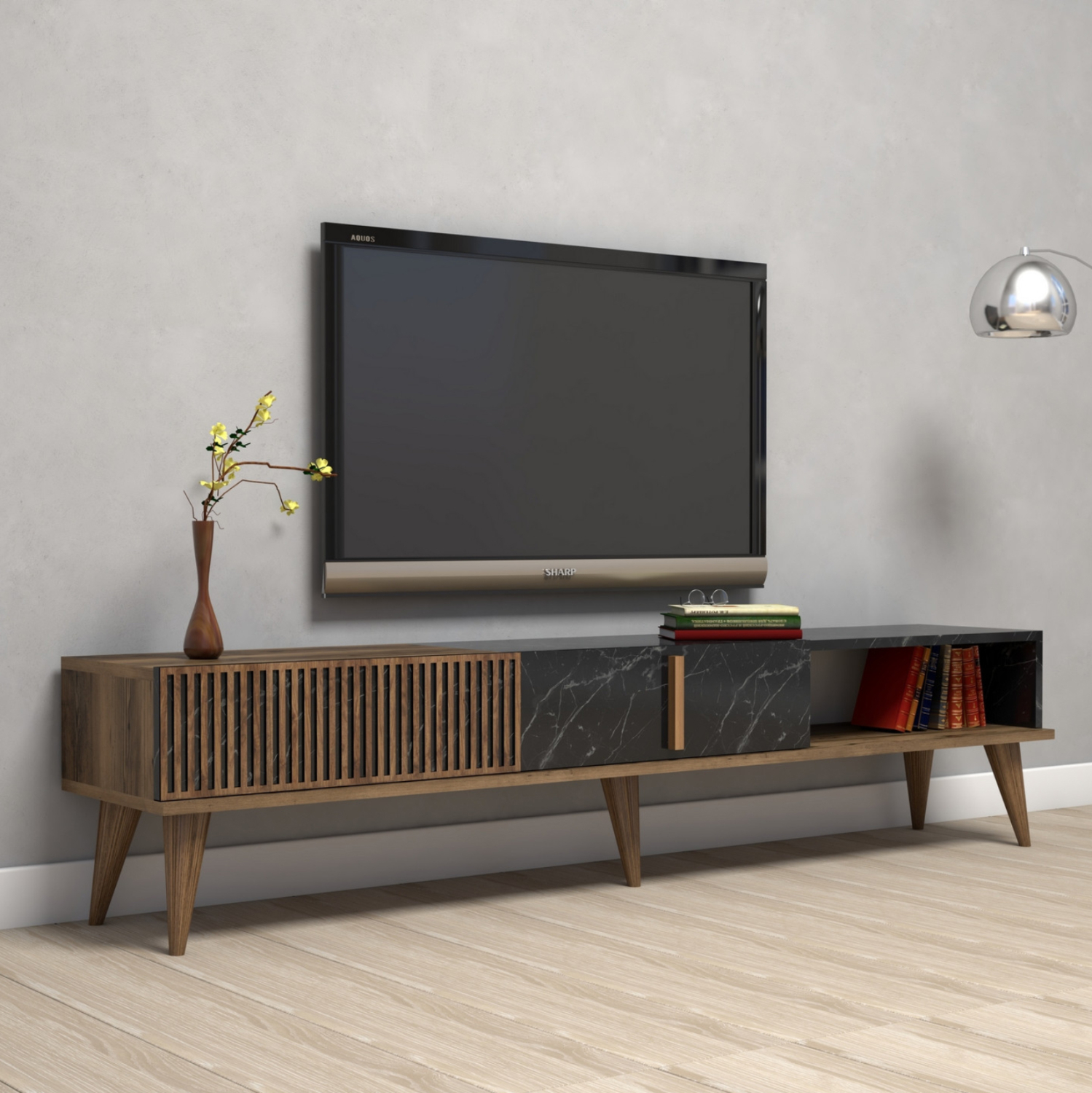 Το ΗΜ9512.02 είναι ένα μοντέρνο και λειτουργικό έπιπλο τηλεόρασης από μελαμίνη σε συνδυασμό χρωμάτων ΚΑΡΥΔΙ και ΟΨΗ ΜΑΥΡΟΥ ΜΑΡΜΑΡΟΥ, που θα ομορφύνει το σαλόνι σας! Είναι μακρύ και διαθέτει 3 ισομεγέθεις χώρους ως κύριο χώρο αποθήκευσης ή τοποθέτησης αντικειμένων. Οι δύο από αυτούς είναι ντουλάπια, που ανοίγουν κατακόρυφα. Τα πόδια είναι ψηλά και στο ίδιο χρώμα με την υπόλοιπη κατασκευή. Οι διαστάσεις του επίπλου είναι κατάλληλες για όλες τις τηλεοράσεις εάν θέλετε η τηλεόρασή σας να στηρίζεται σε βάση. Πρόκειται για μια κομψή πρόταση για το σαλόνι σας!