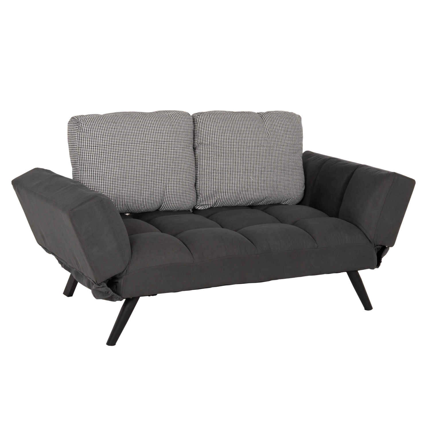Μοντέρνος καναπές κρεβάτι πολυμορφικός με αναδιπλούμενα μπράτσα, μαξιλάρια και επένδυση από ΓΚΡΙ ύφασμα.
