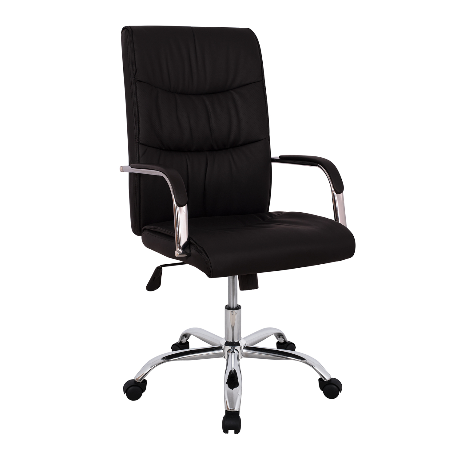 Διευθυντική καρέκλα γραφείου “JACOB” σε μαύρο χρώμα. Μια «πλούσια» καρέκλα γραφείου με ψηλά επίπεδα inox μπράτσα με στρογγυλεμένες γωνίες, επενδυμένα με μια λεπτή στρώση αφρολέξ σε PU δέρμα. Η πλάτη είναι ανατομική και ψηλή με «μαξιλάρι» από αφρώδη υλικά για άνεση κατά την χρήση και υποστηρίζει ολόκληρο τον κορμό σας, ενώ είναι επενδυμένη με υψηλής ποιότητας PU δέρμα , όπως επίσης και το φαρδύ και αναπαυτικό κάθισμα με την αναπαυτική επιφάνεια. Η βάση είναι inox σε σχήμα «αστέρι».