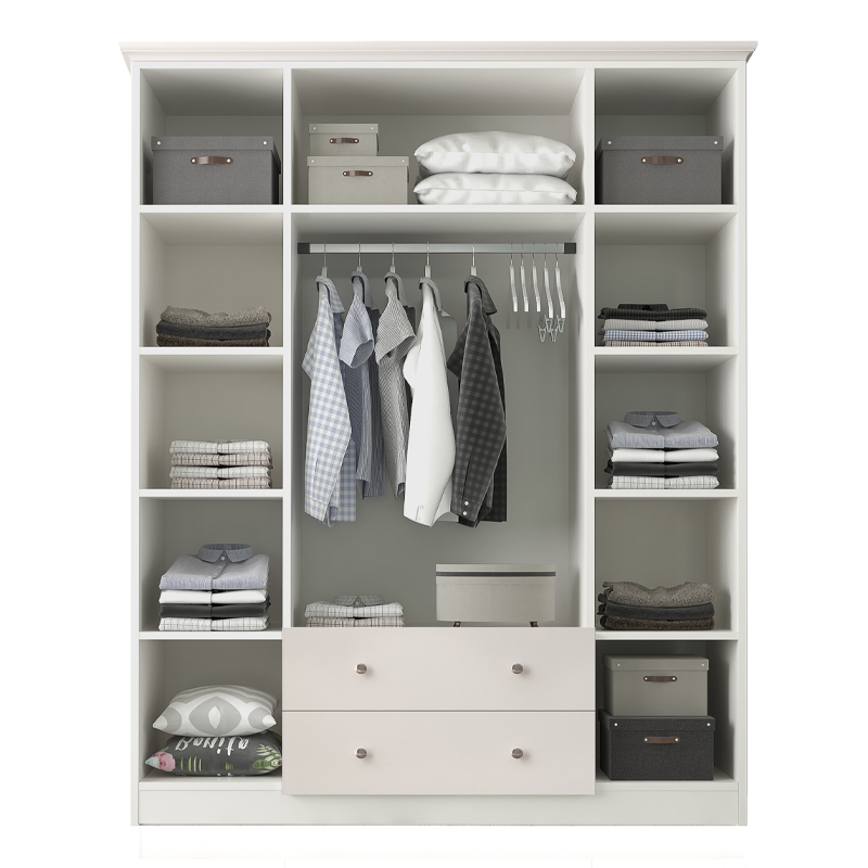 - Μια κεντρική διπλή ντουλάπα, στο εσωτερικό της φέρει μια βέργα αλουμινίου για κρεμάστρες. Στο κάτω μέρος φέρει δύο πρακτικά συρόμενα συρτάρια.