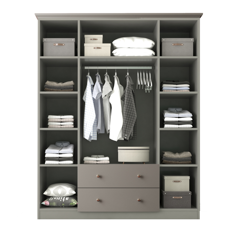 - Μια κεντρική διπλή ντουλάπα, στο εσωτερικό της φέρει μια βέργα αλουμινίου για κρεμάστρες. Στο κάτω μέρος φέρει δύο πρακτικά συρόμενα συρτάρια.