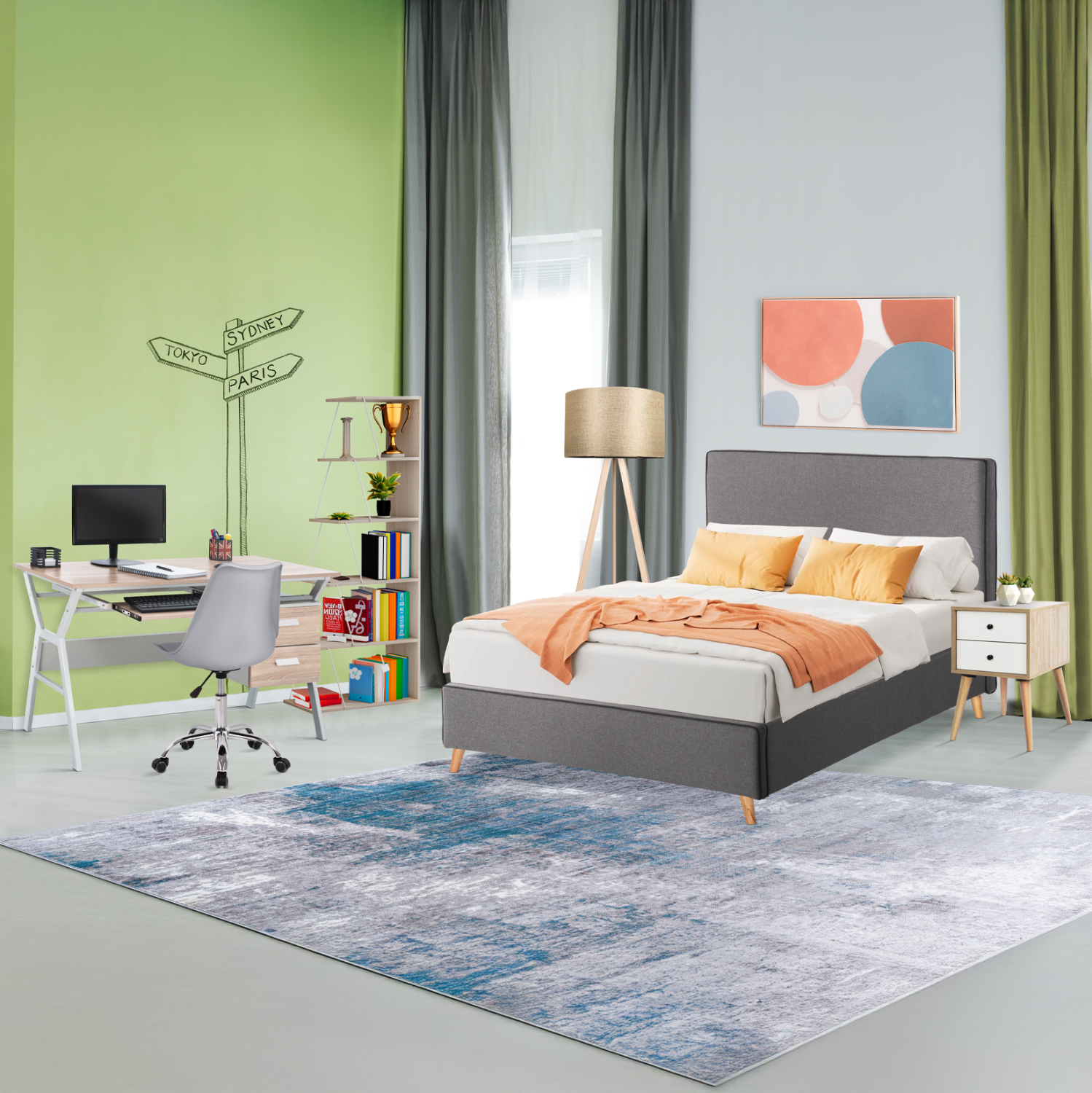Αυτό το σετ περιλαμβάνει κρεβάτι, κομοδίνο, γραφείο, βιβλιοθήκη, καρέκλα γραφείου