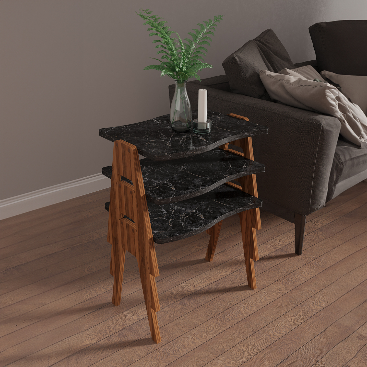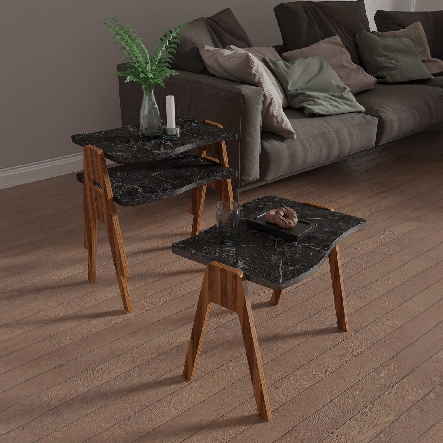 Τα τραπεζάκια ζιγκόν ESSENT θα σας ενθουσιάσουν με το στυλ και την πρακτικότητά τους. Δώστε νέα εικόνα στον χώρο σας με αυτά τα 3 τραπεζάκια μελαμίνης 18mm σε συνδυασμό χρωμάτων ΚΑΡΥΔΙ με επιφάνειες με καμπύλες σε ΟΨΗ ΜΑΥΡΟΥ ΜΑΡΜΑΡΟΥ, που αποθηκεύονται το ένα κάτω από το άλλο.