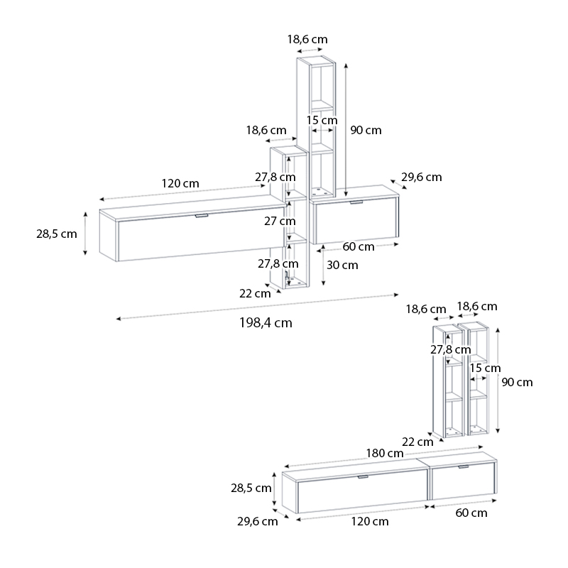 - Η σύνθεση διαθέτει δύο επιτοίχιες ραφιέρες, τις οποίες μπορείτε να τοποθετήσετε όπως επιθυμείτε.