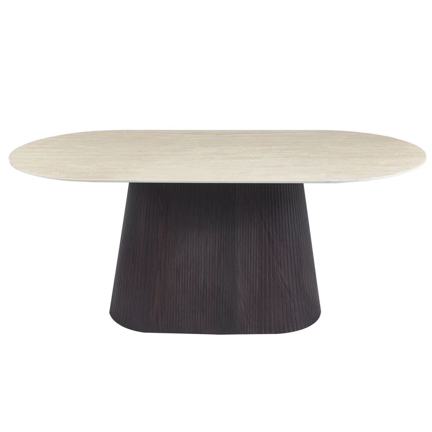 Το τραπέζι τραπεζαρίας CATER είναι οβάλ και αποτελεί νέα προσθήκη στην γκάμα μας. Η επίπεδη επιφάνειά του είναι κεραμική σε χρωματισμό TRAVERTINE STONE, ενώ η βάση του είναι κατασκευασμένη εξολοκλήρου από MDF σε χρώμα ΣΚΟΥΡΟ ΚΑΦΕ, με όμορφες πτυχώσεις.