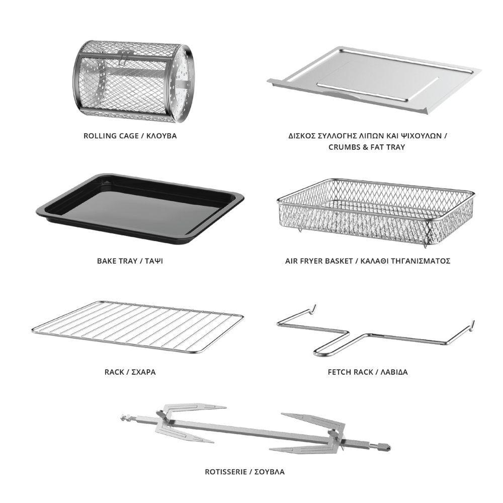 Υγιεινό μαγείρεμα φριτέζας αέρος με 80% λιγότερο λάδι XXL χωρητικότητα 23lt 1700W – Εξοικονόμηση ενέργειας συγκριτικά με φούρνο 3 επίπεδα σχάρας ή ταψιού Περιέχονται: ταψί, καλάθι τηγανίσματος αεροφριτέζες, σχάρα, σούβλα , κλούβα, λαβίδα, περιστρεφόμενο μπάρμπεκιου – rotisserie Μεγάλο παράθυρο παρακολούθησης ψησίματος Ιδανικό για να μαγειρεύει, τηγανίζει με ελάχιστο λάδι, ψήνει, σουβλίζει, ψήνει ψωμί& γλυκά́, ξεπαγώνει κλπ Αποξηραίνει 230V, 50Hz, 1700W (ΠxΒxΥ) 47*43*44 με συσκευασία (ΠxΒxΥ) 41*37*35 χωρίς συσκευασία