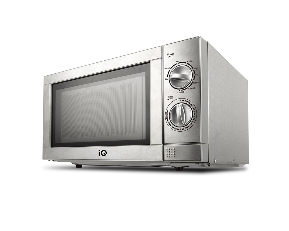 Φούρνος μικροκυμάτων με ανοξείδωτη πρόσοψη, ιδανικό για μικρότερες κουζίνες, με πέντε επίπεδα θερμοκρασίας και λειτουργία απόψυξης τροφίμων.