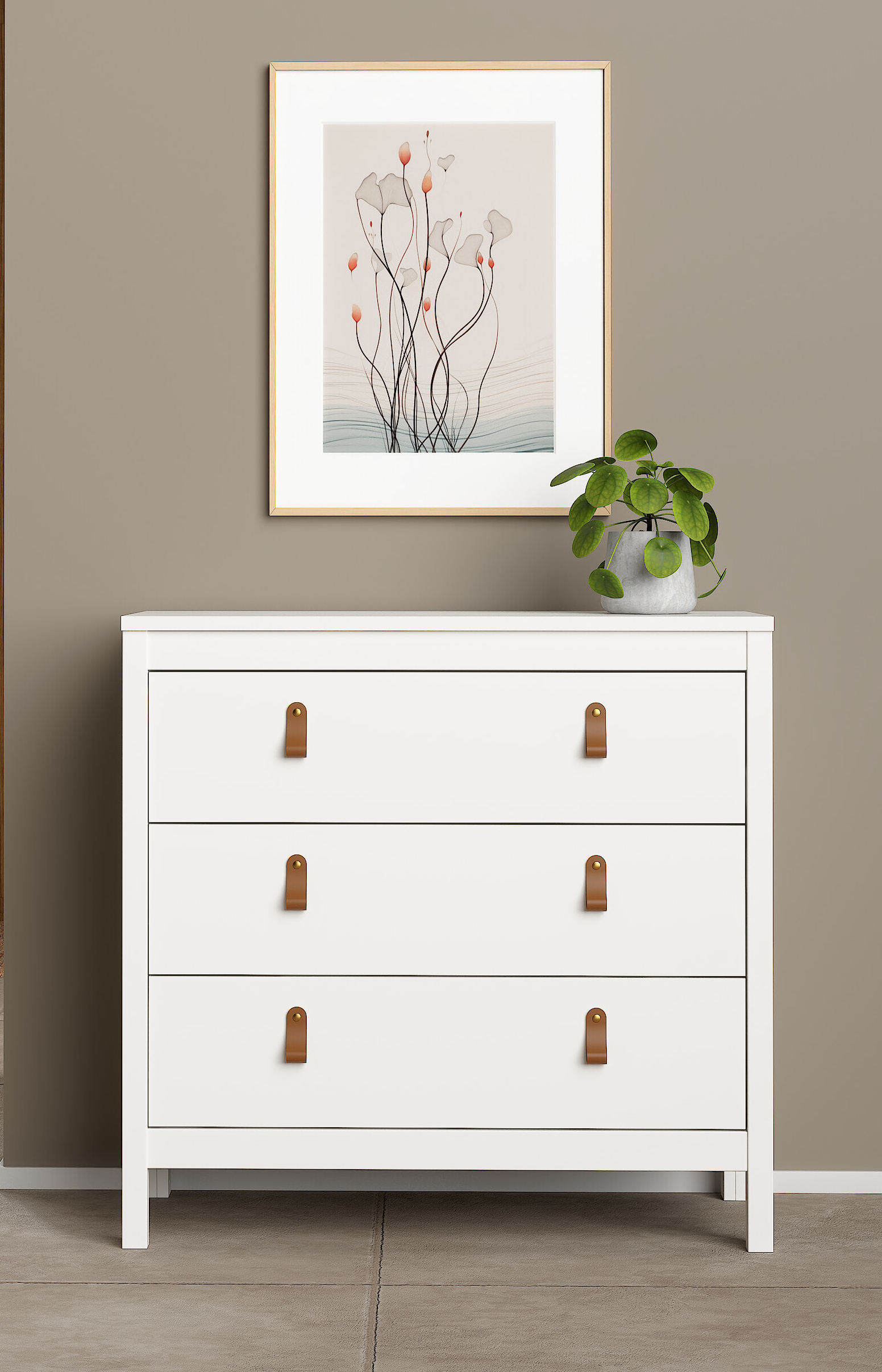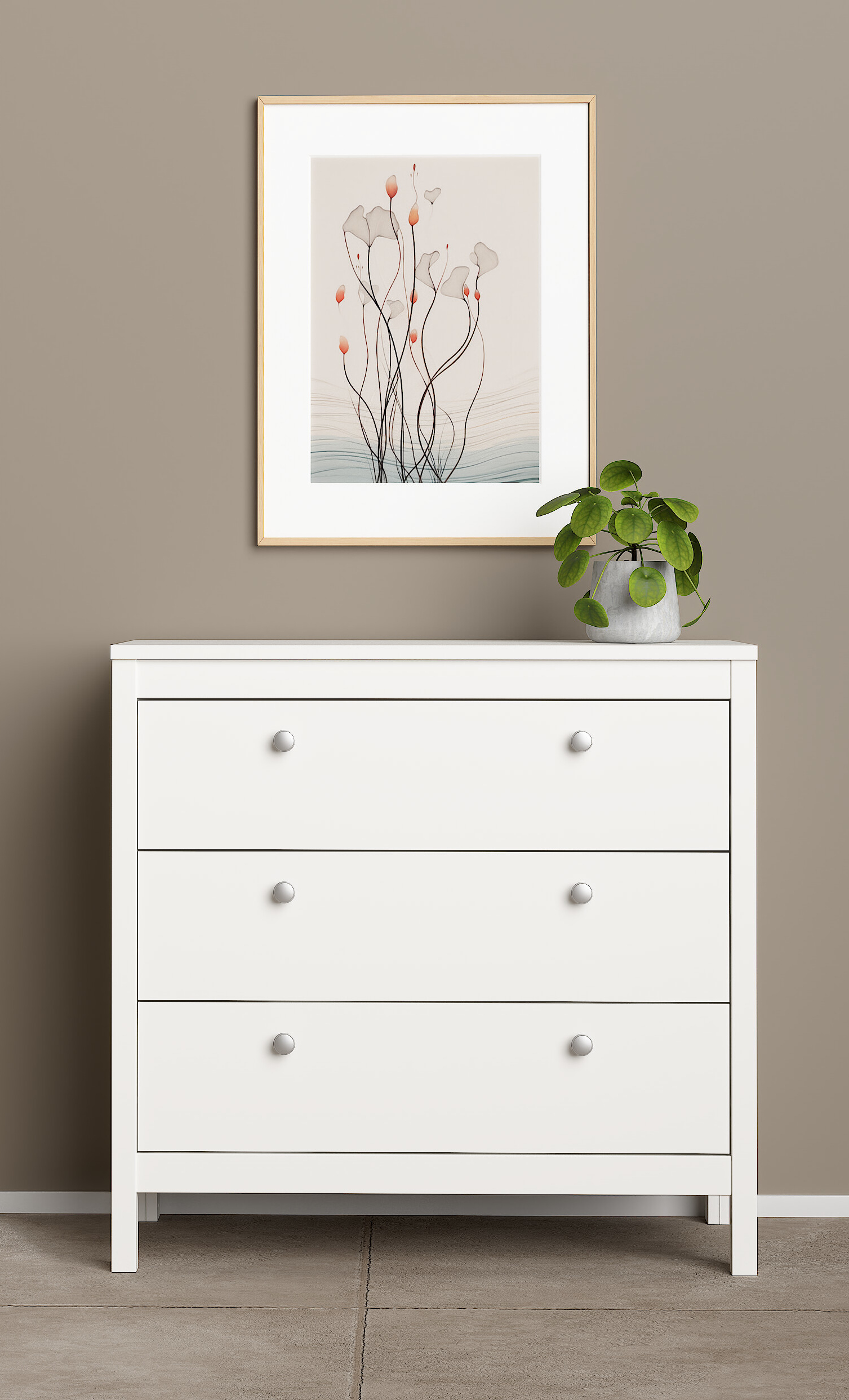 Η συρταριέρα Madrid είναι μοντέρνα και πρακτική. Οι διαστάσεις της είναι 82,3×38,4εκ. ( ύψος 79,7εκ. ) και το χρώμα της είναι λευκό. Διαθέτει 3 συρτάρια. . Μπορείτε να προσαρμόσετε την εμφάνισή της επιλέγοντας ανάμεσα σε 2 διαφορετικά σετ πόμολα ( δερματίνη ή μεταλλικά ) . Η συρταριέρα Madrid κατασκευάζεται στη Δανία.