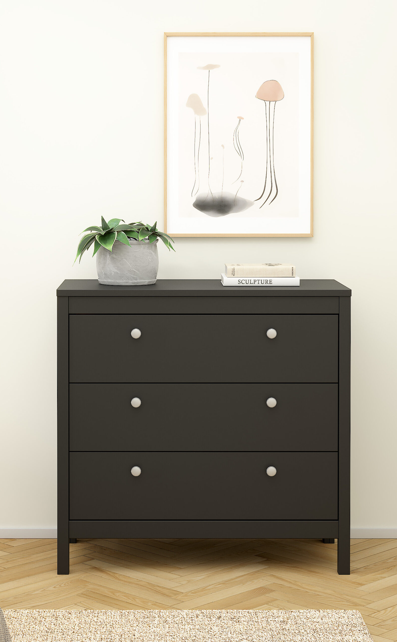 Η συρταριέρα Madrid είναι μοντέρνα και πρακτική. Οι διαστάσεις της είναι 82,3×38,4εκ. ( ύψος 79,7εκ. ) και το χρώμα της είναι μαύρο. Διαθέτει 3 συρτάρια. . Μπορείτε να προσαρμόσετε την εμφάνισή της επιλέγοντας ανάμεσα σε 2 διαφορετικά σετ πόμολα ( δερματίνη ή μεταλλικά ) . Η συρταριέρα Madrid κατασκευάζεται στη Δανία.