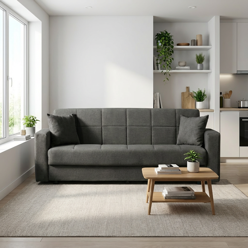 Ο καναπές-κρεβάτι Sebastian συνδυάζει μοντέρνο σχεδιασμό και πρακτικότητα, αποτελώντας ιδανική λύση για καθιστικά και μικρούς χώρους. Διαθέτει διαστάσεις 209×78 εκ. με ύψος 80 εκ. και είναι επενδεδυμένος με ανθρακί ύφασμα που ταιριάζει εύκολα σε κάθε διακόσμηση. Με έναν εύχρηστο μηχανισμό, μετατρέπεται γρήγορα σε άνετο κρεβάτι διαστάσεων 103×180 εκ.. Επιπλέον, ο ενσωματωμένος αποθηκευτικός χώρος προσφέρει έξυπνη οργάνωση και εξοικονόμηση χώρου, καθιστώντας τον Sebastian μια ολοκληρωμένη επιλογή καναπέ κρεβατιού με αποθήκευση για το σύγχρονο σπίτι.