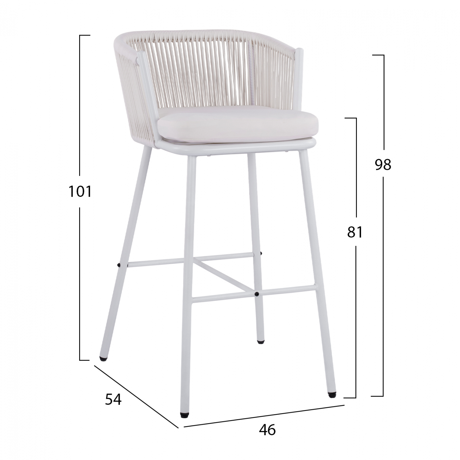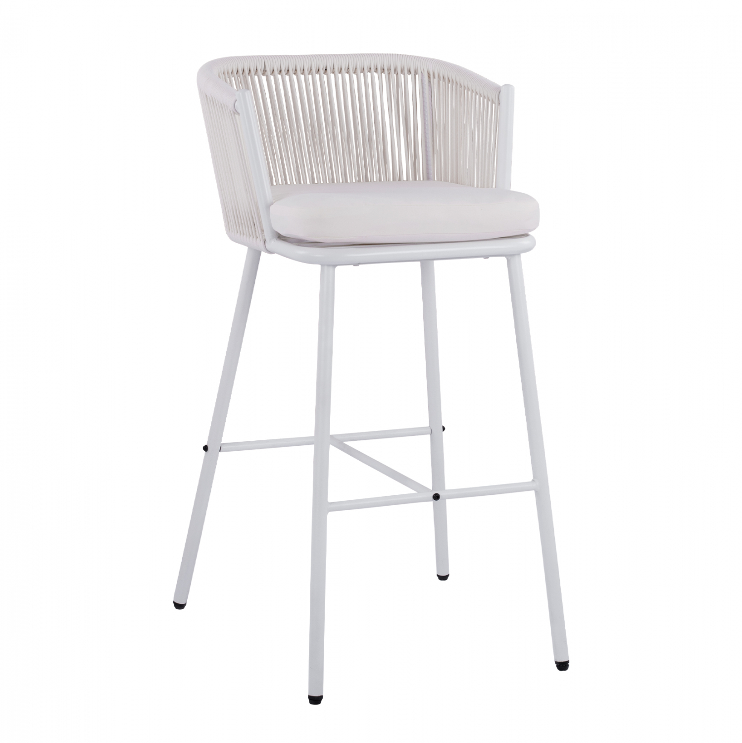 Μοντέρνο σκαμπό με πλάτη και μαξιλάρι, εξωτερικού αλλά και εσωτερικού χώρου, κατασκευασμένο από μεταλλικό σκελετό σε λευκή απόχρωση, επενδυμένο με πλεκτό σχοινί σε λευκή απόχρωση.