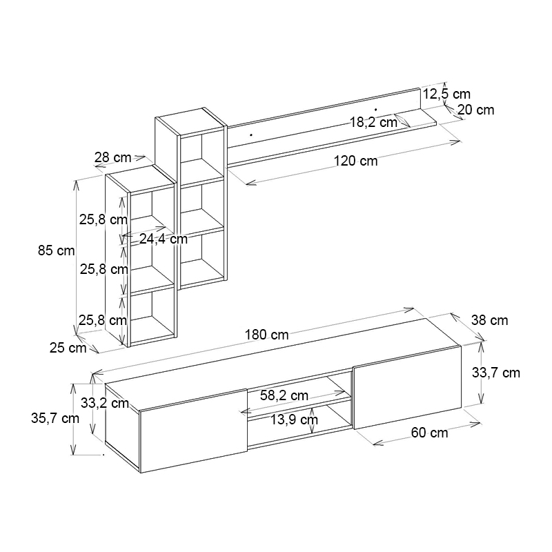- Η σύνθεση διαθέτει τρεις επιτοίχιες ραφιέρες, οι οποίες μπορούν να τοποθετηθούν όπως επιθυμείτε.